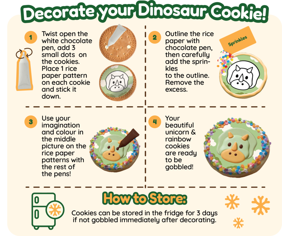 Make your own cookie decoration using yummy chocolate sauces and bring each dino character to life! Follow the sugar sheet templates in the box and get creative on coloring your dinos however you like for a fun and tasty decorating adventure.